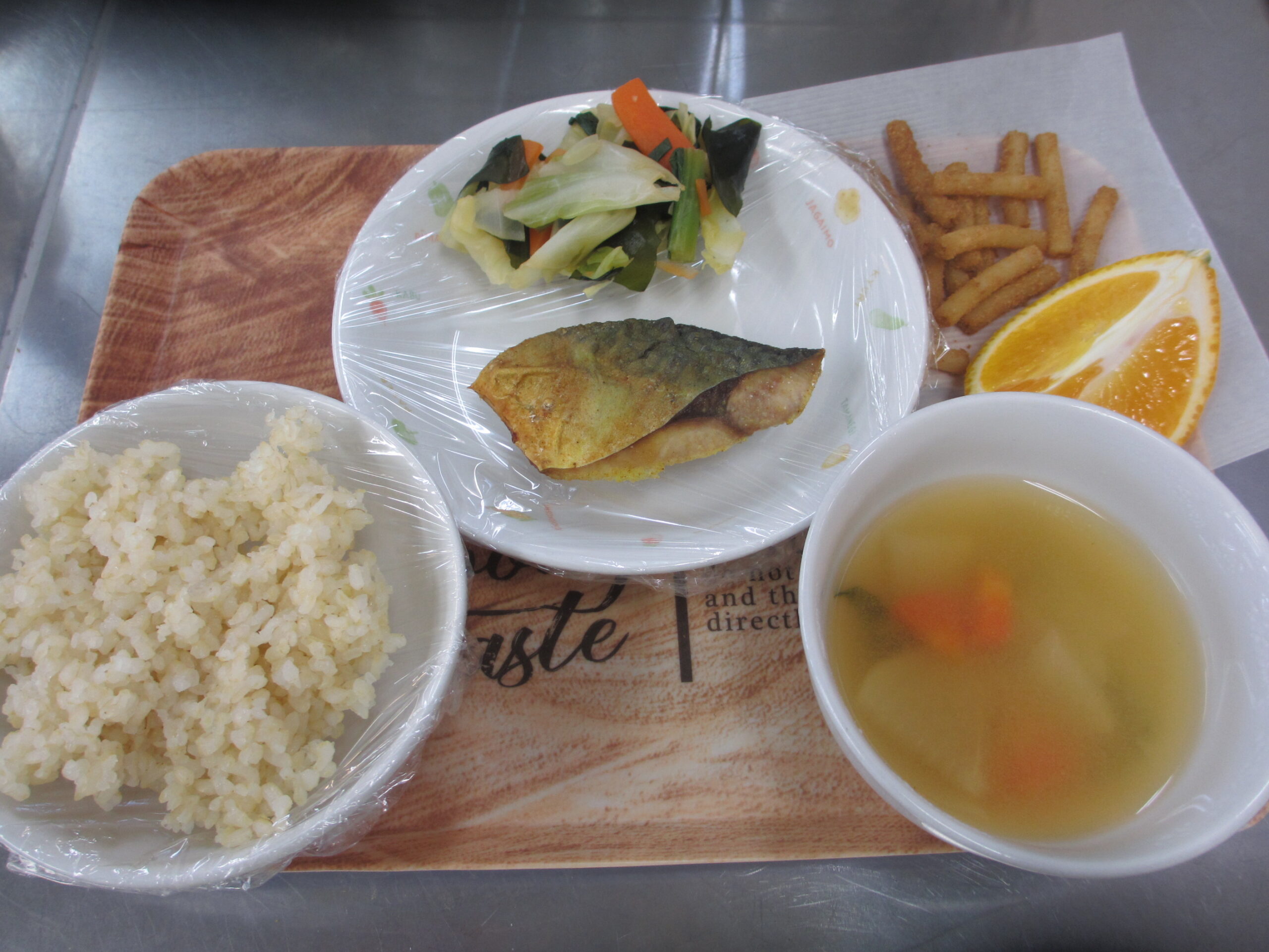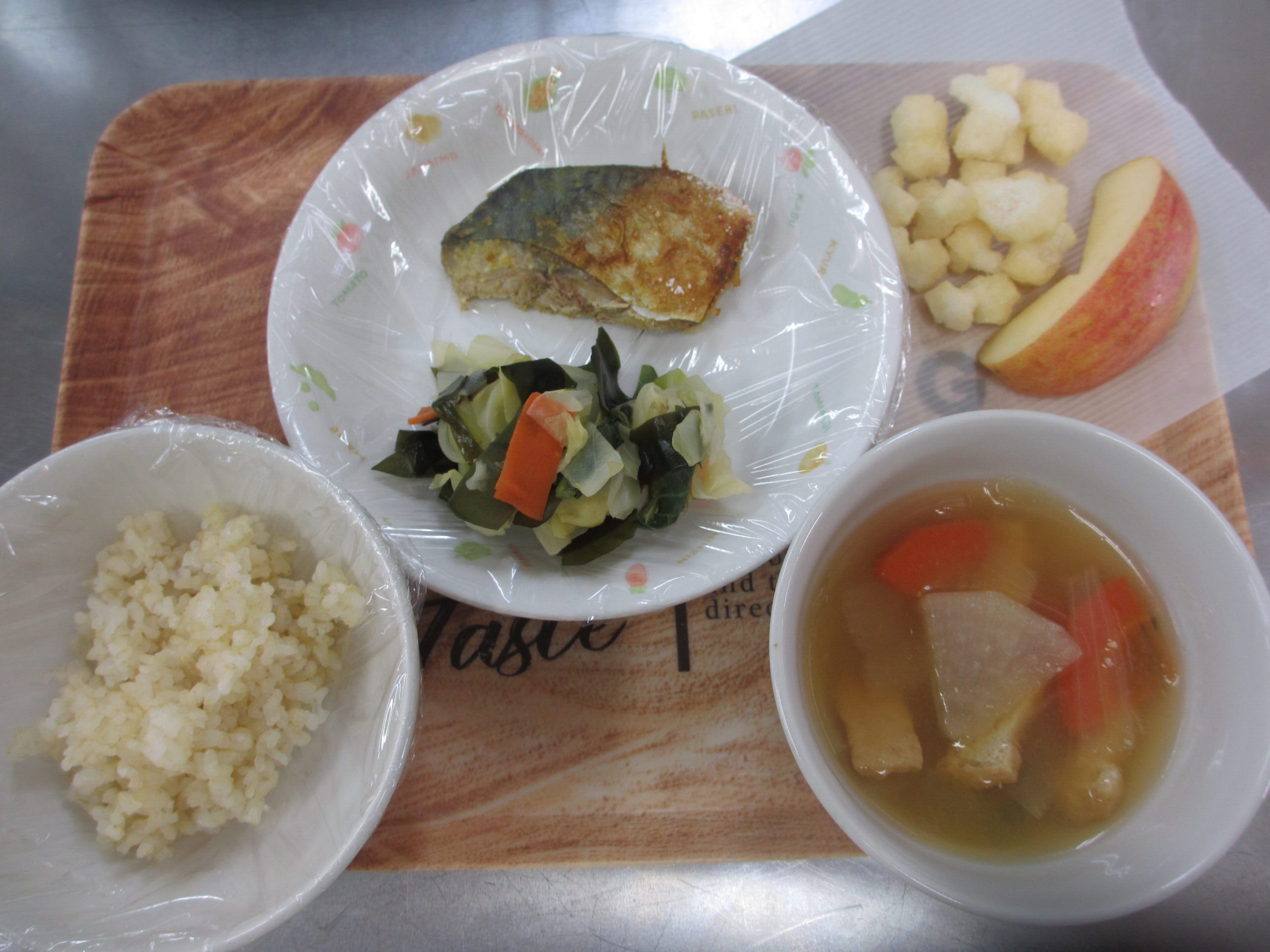 お昼:ごはん 鯖のカレームニエル 野菜和え 味噌汁