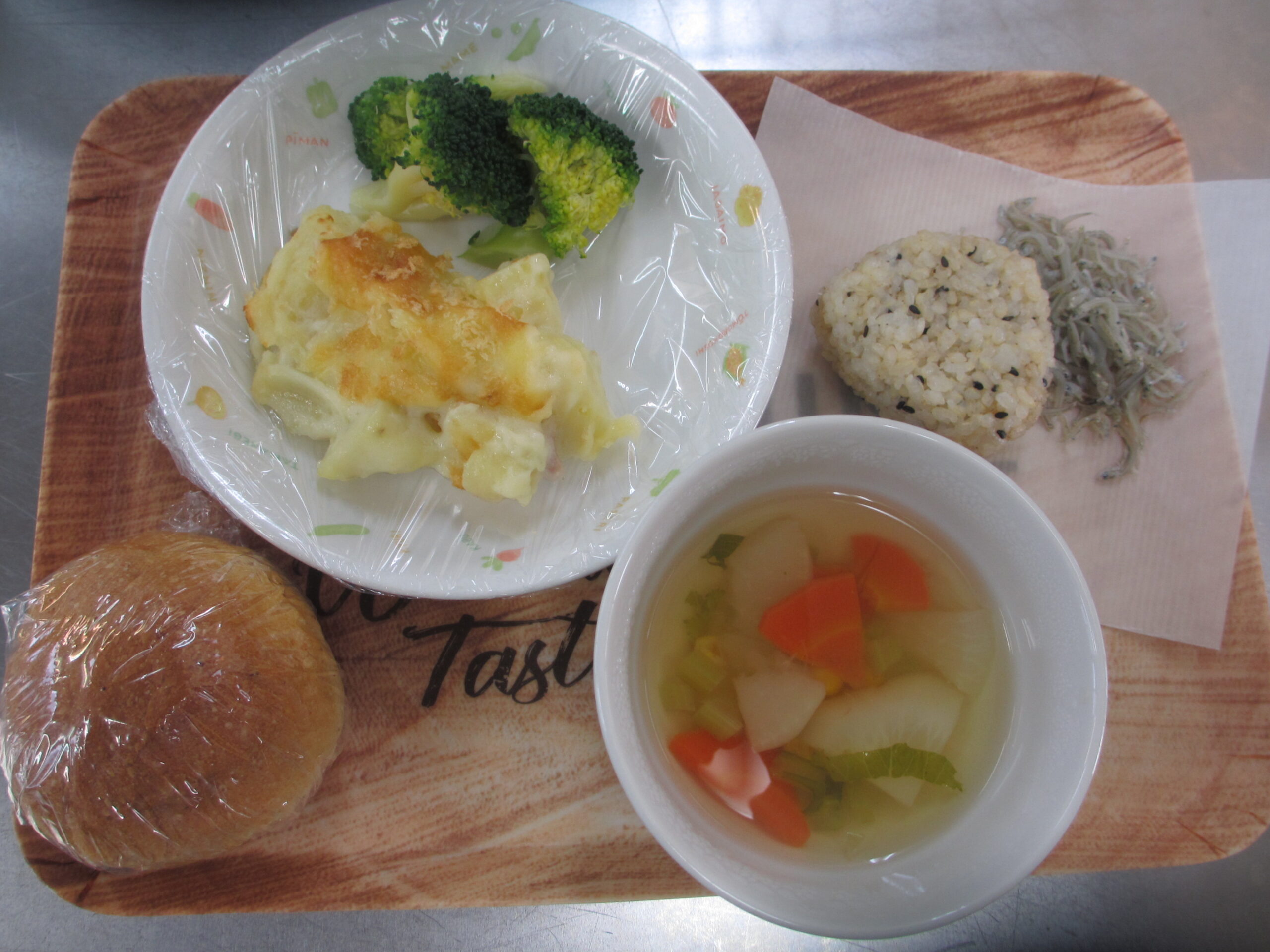 お昼:パン グラタン ブロッコリー 野菜スープ