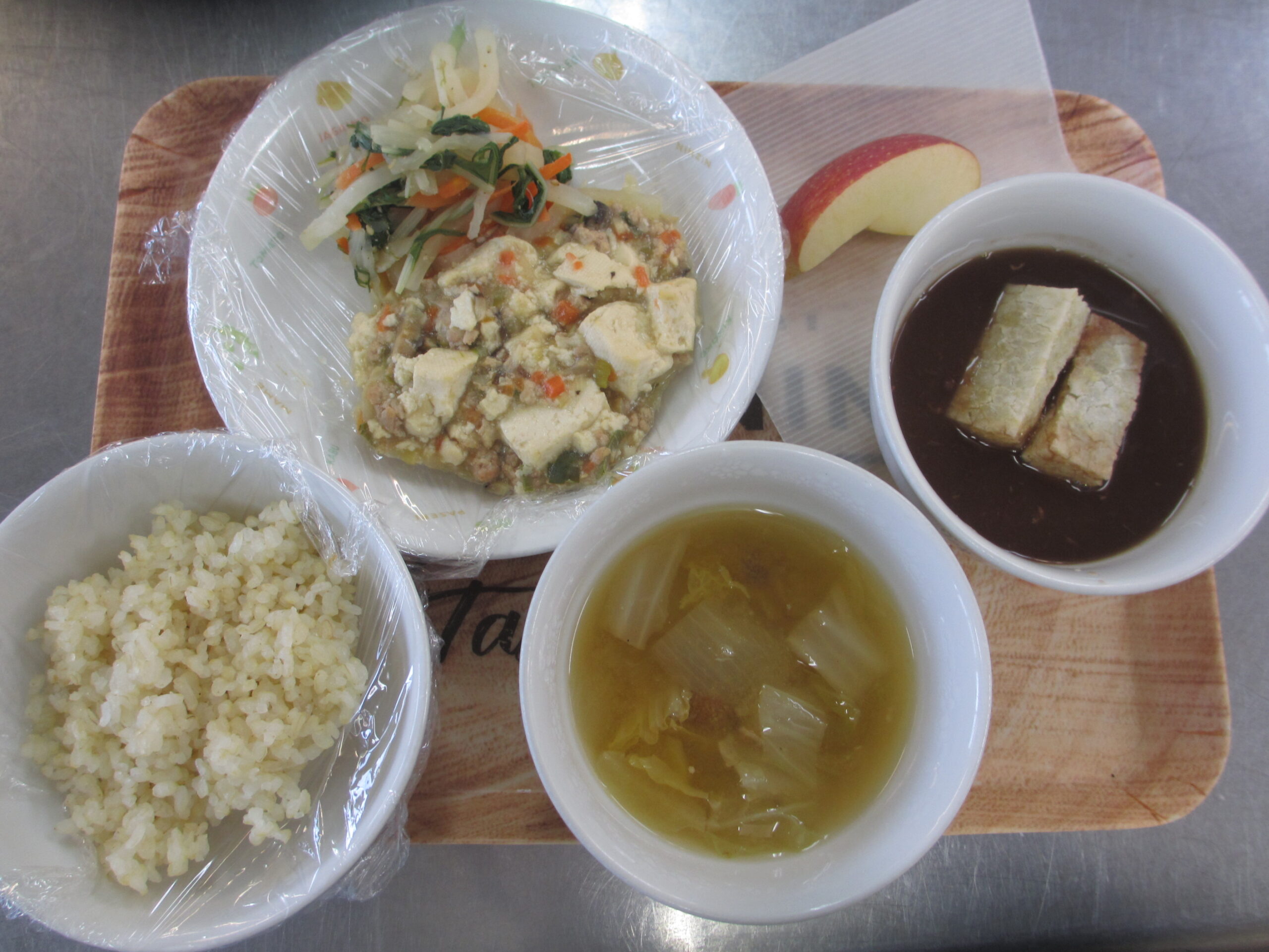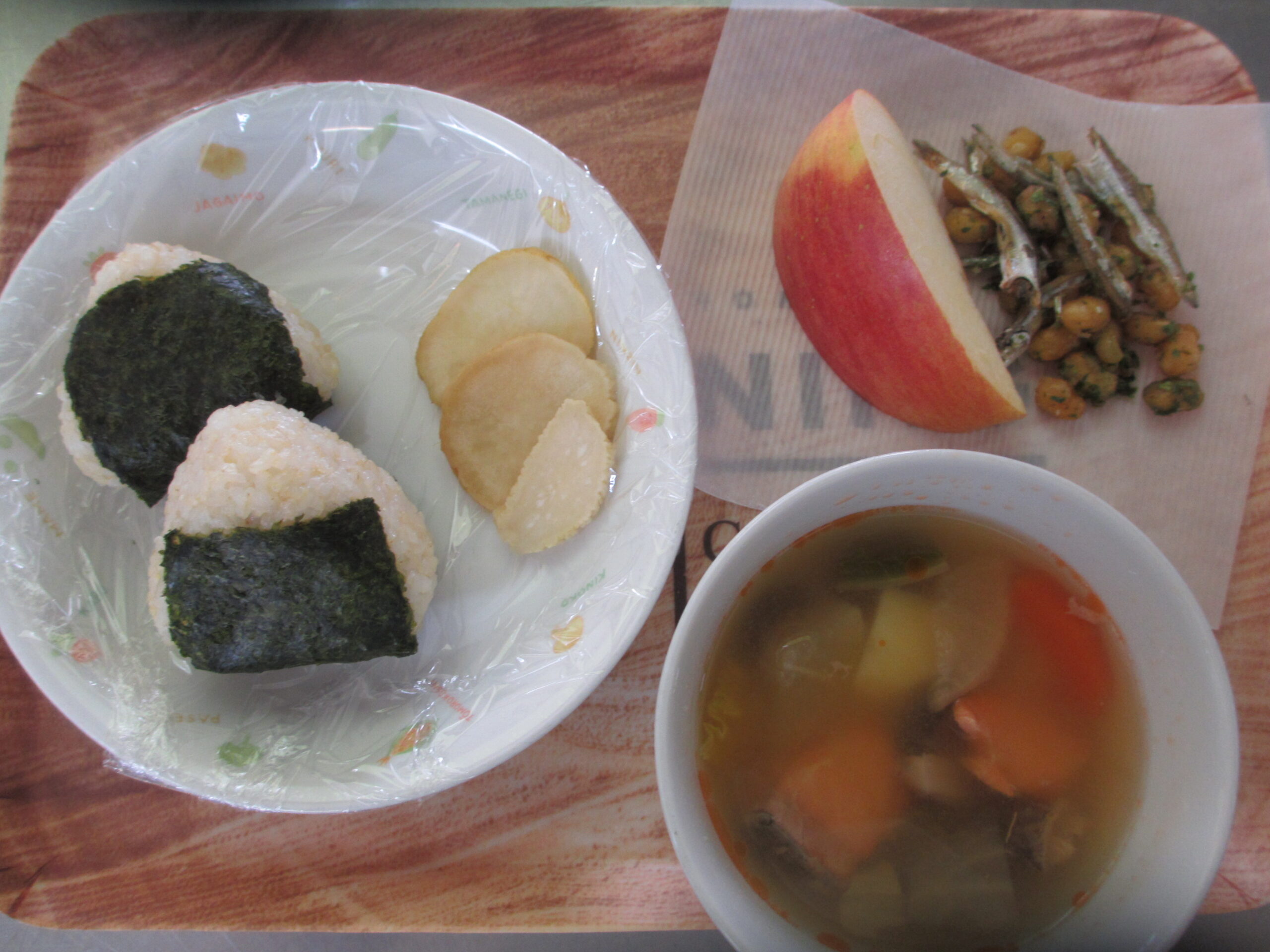 おやつ:お茶 りんご 大豆と小魚のいりこ揚げ