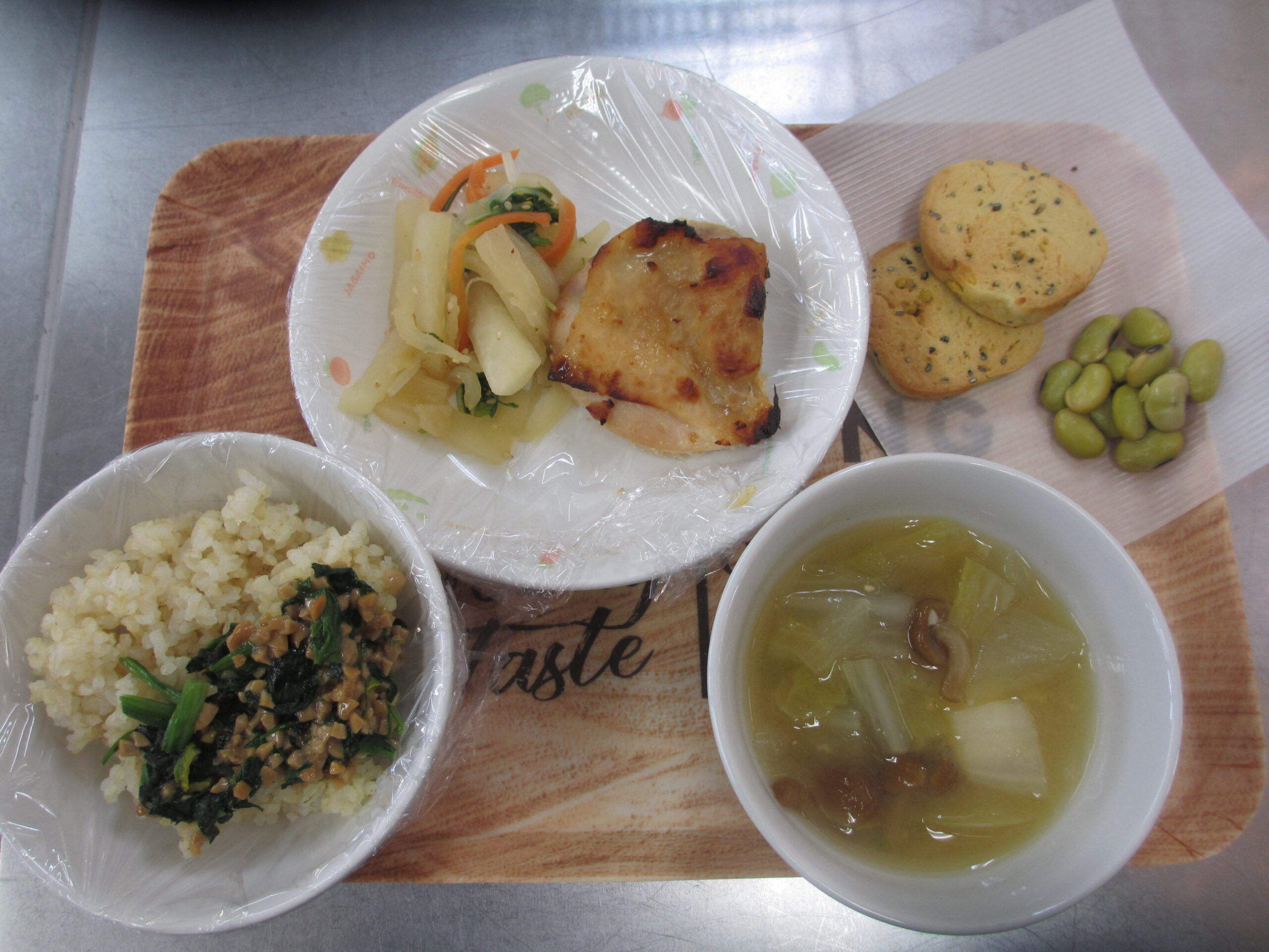 お昼:納豆ご飯 鶏の味噌焼き 和風大根サラダ 味噌汁