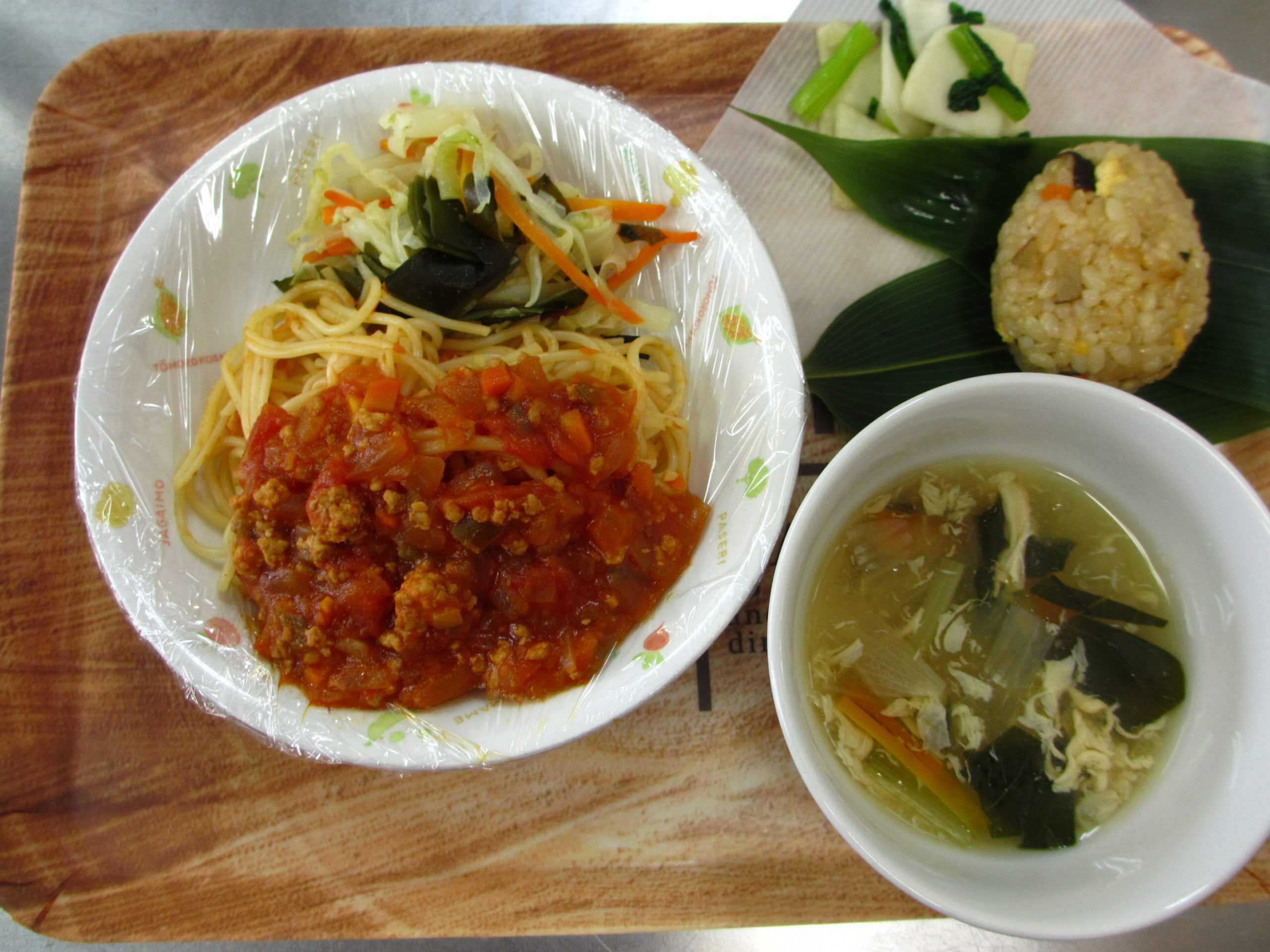 お昼:ミートソーススパゲティ・わかめサラダ・かきたま汁