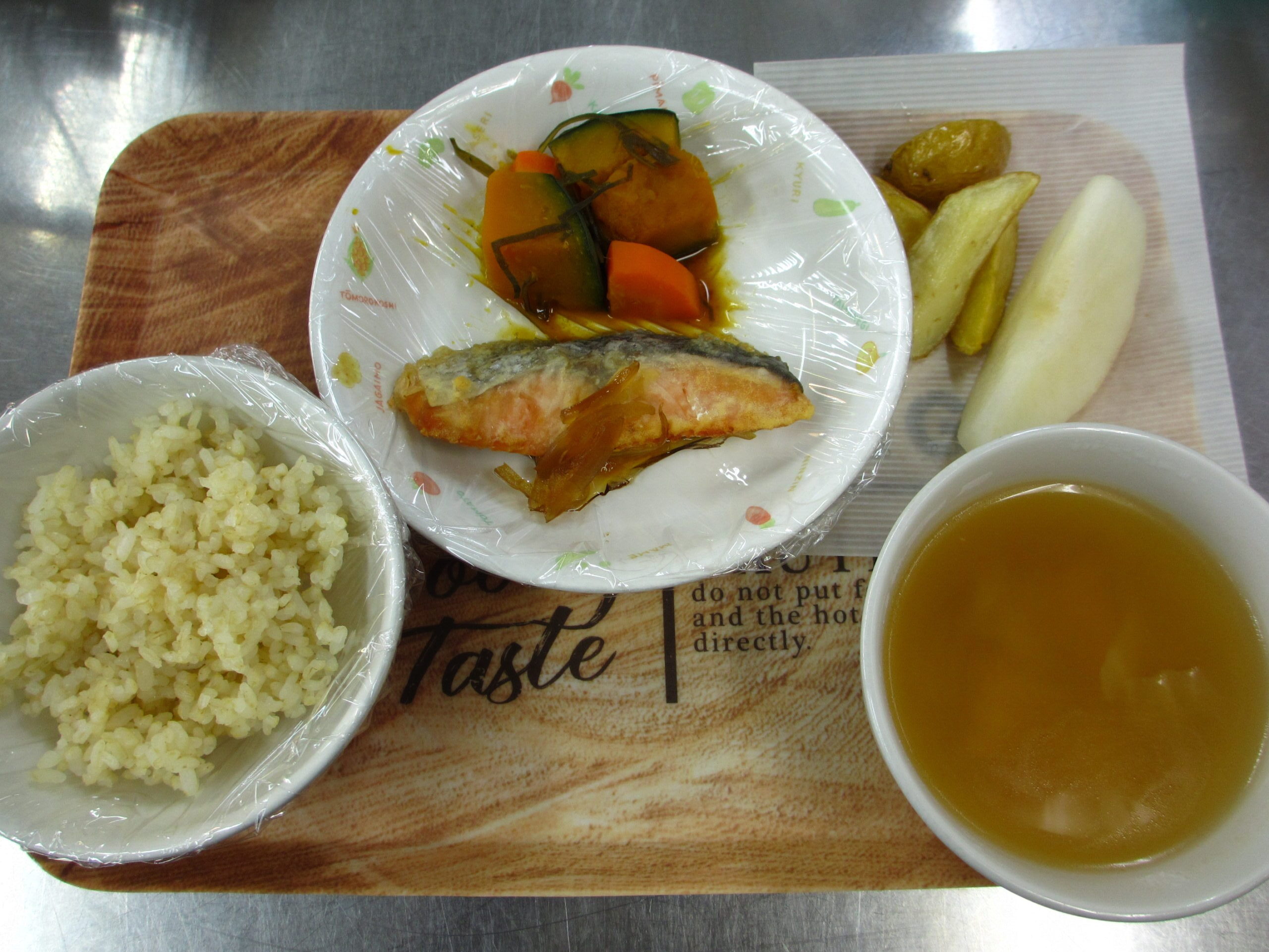 お昼:ごはん・鮭の南蛮漬け・切り昆布・味噌汁