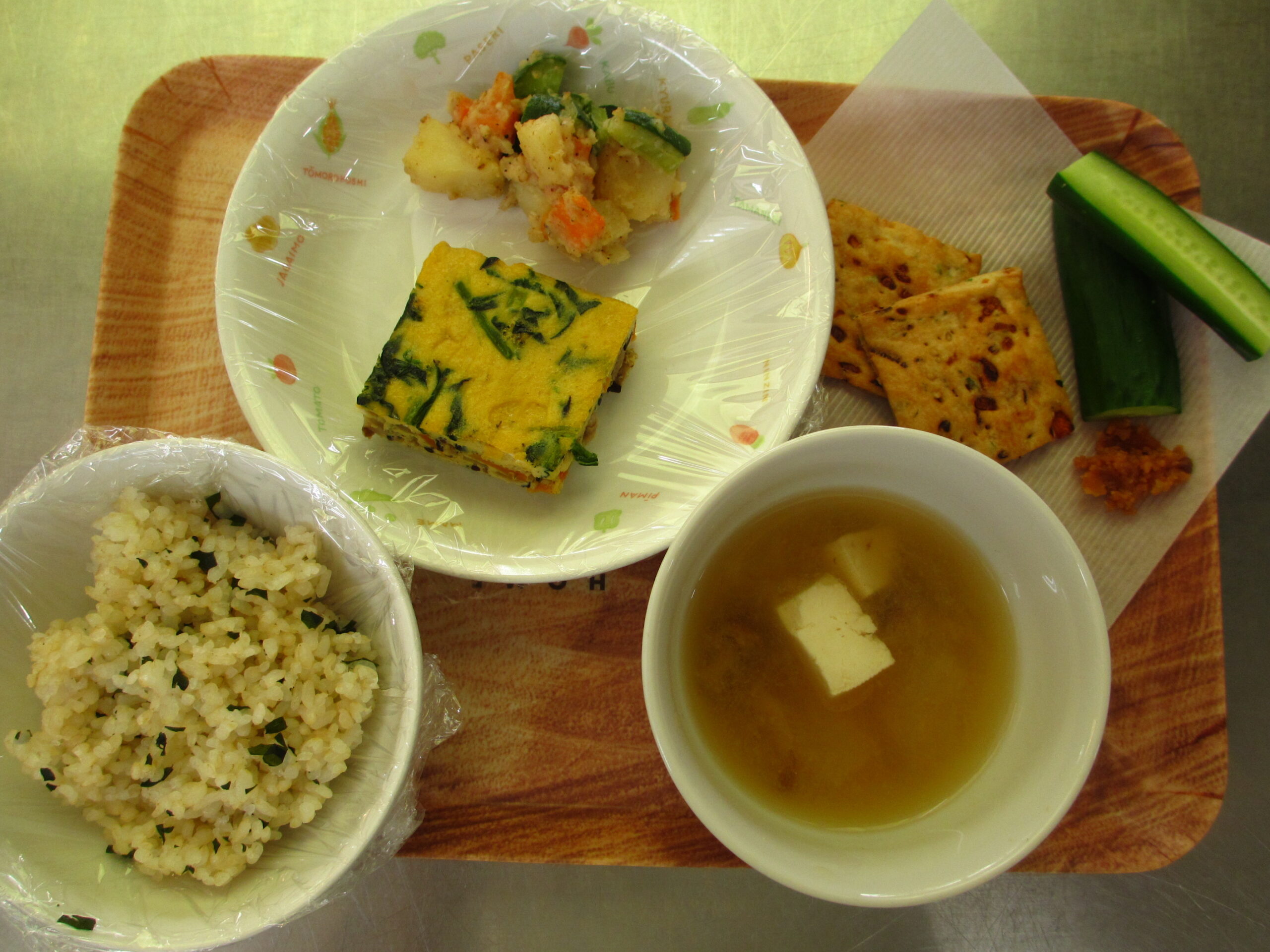 昼食:わかめごはん・五目卵焼き・ごまドレサラダ・味噌汁