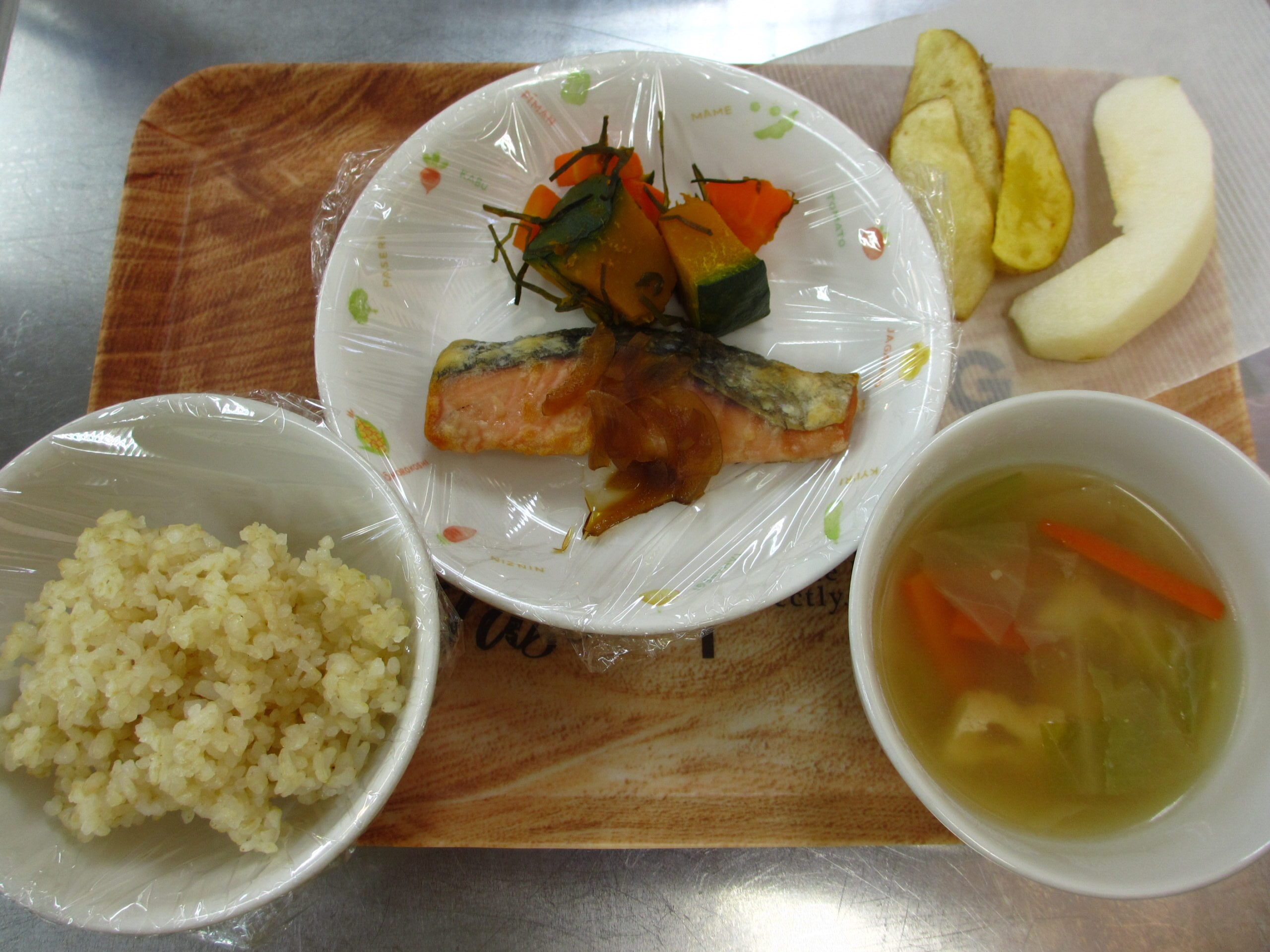 昼食:ごはん・鮭の南蛮漬け・切り昆布煮・味噌汁