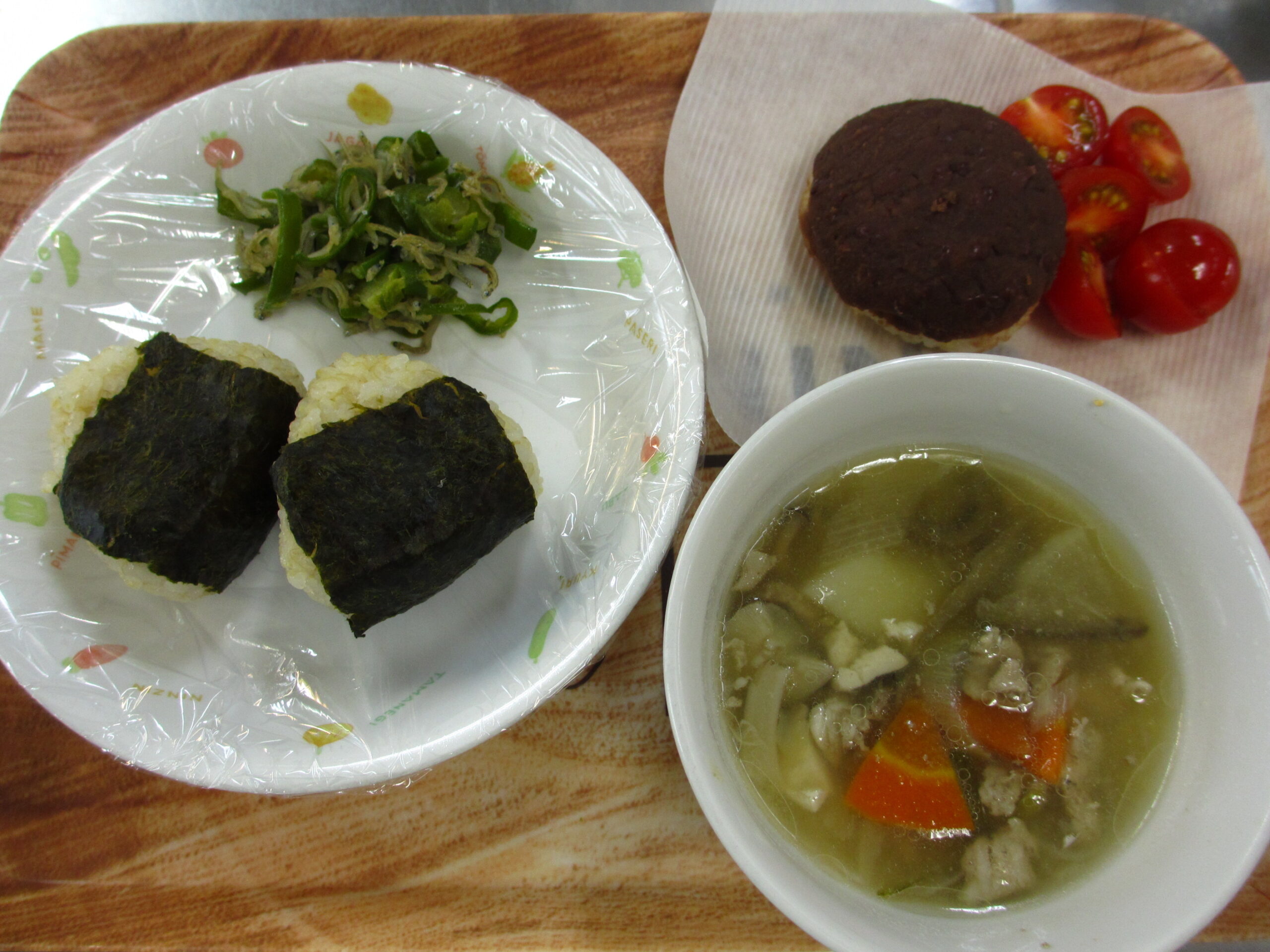 昼食:のりおにぎり・じゃこピーマン・豚汁