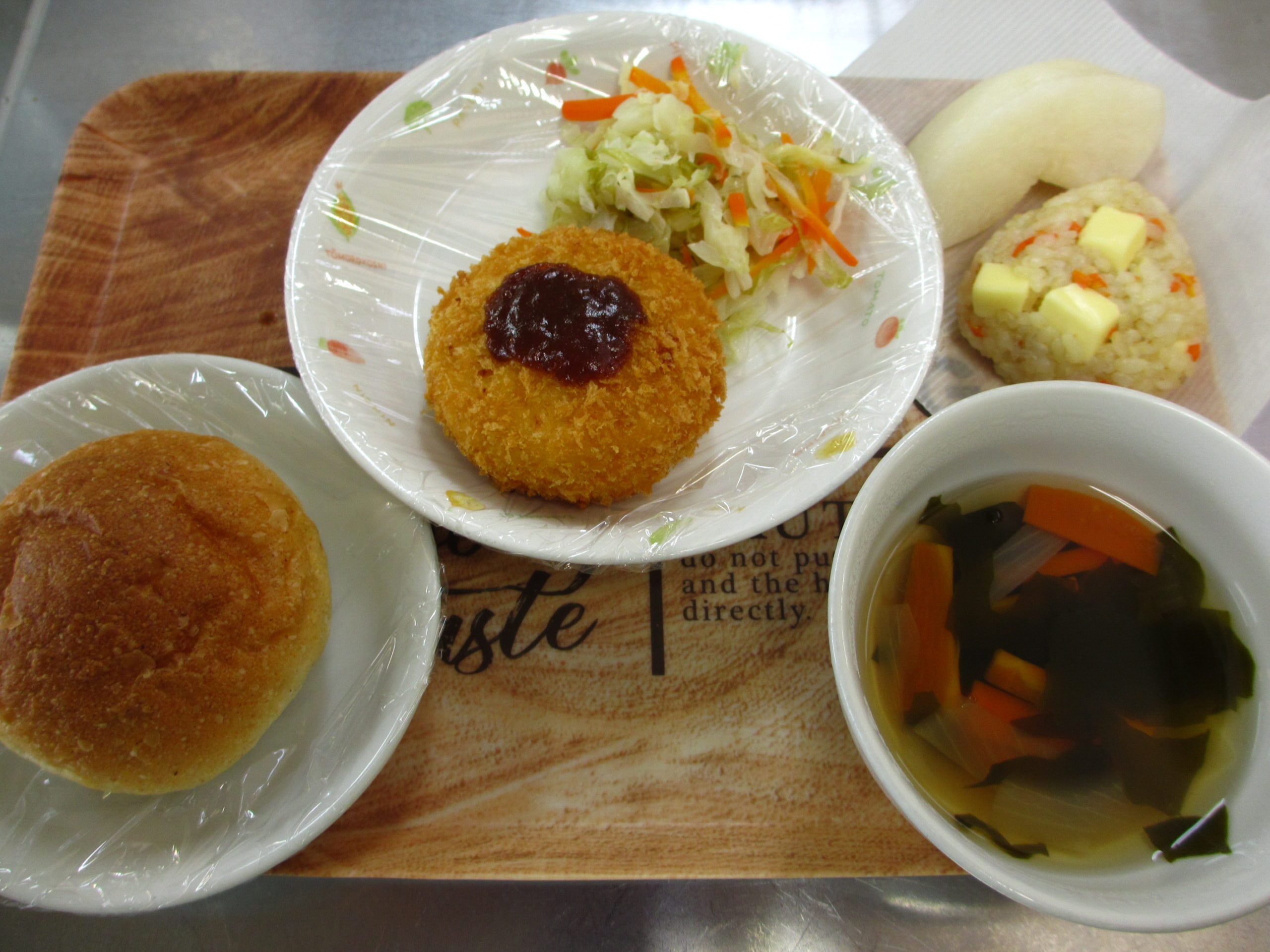 昼食:パン・コロッケ・コールスロー・わかめスープ