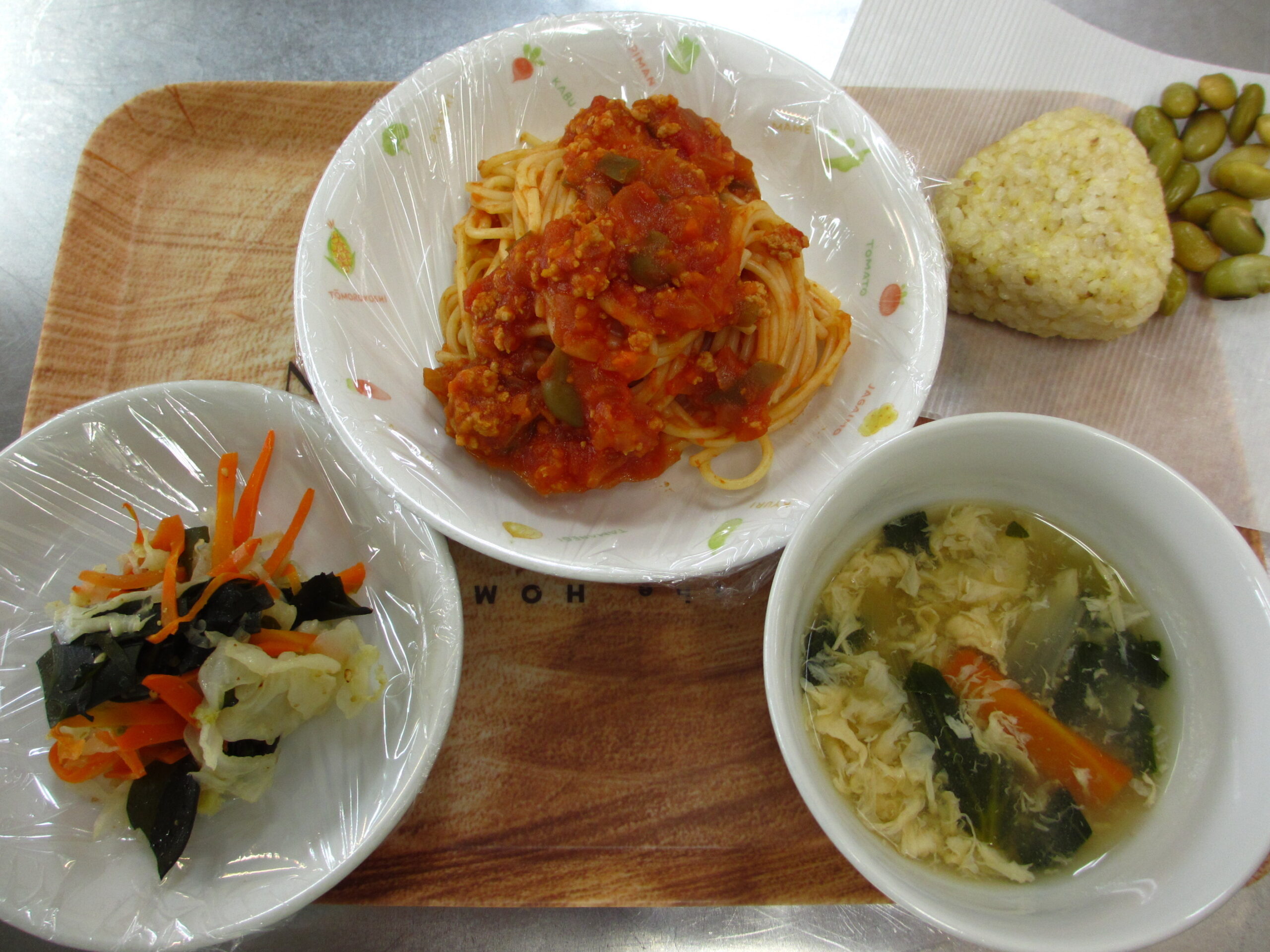 お昼:ミートソーススパゲティ わかめサラダ かきたま汁
