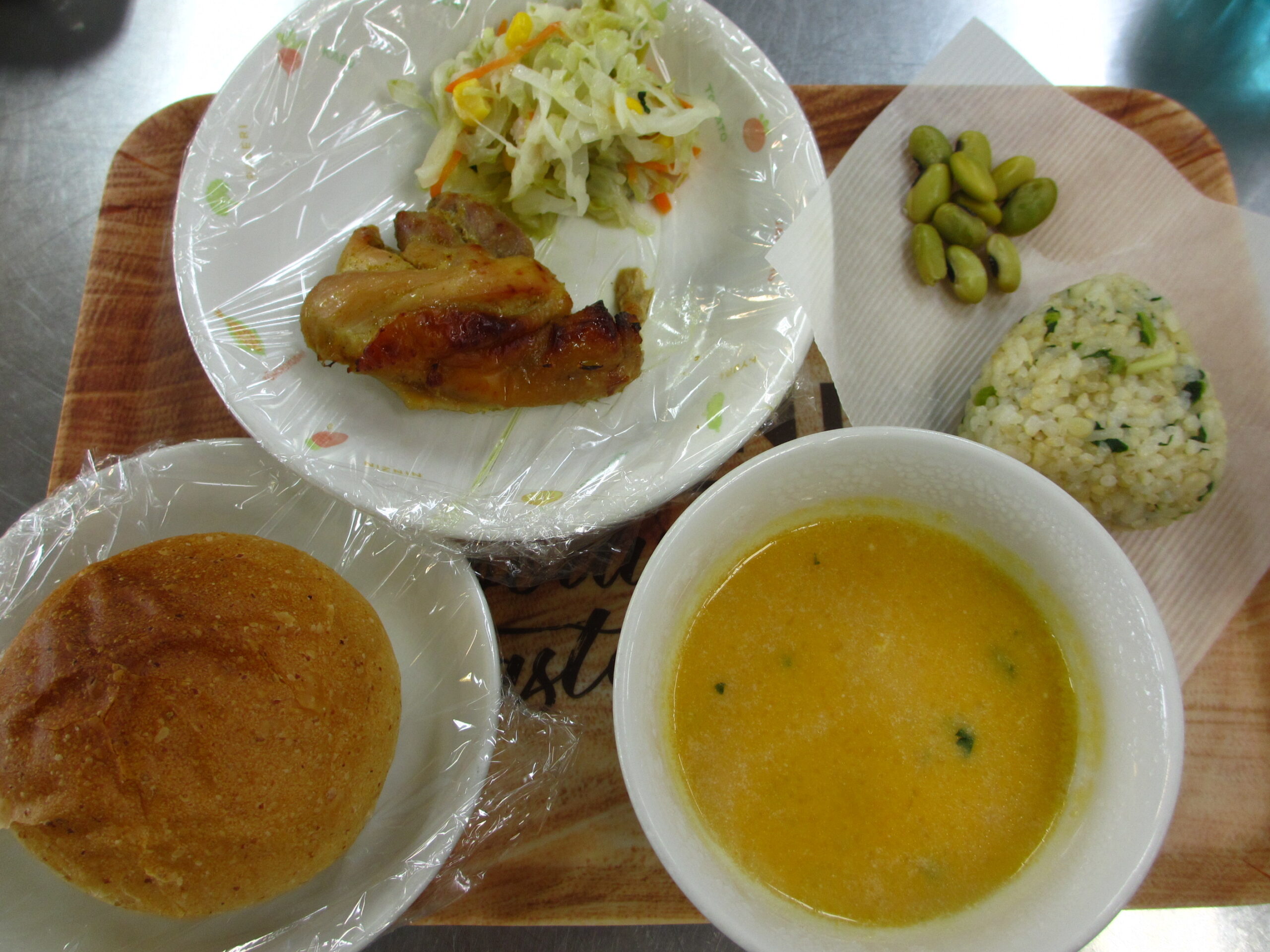 お昼:パン ハニースパイシーチキン コーンサラダ 南瓜のポタージュ
