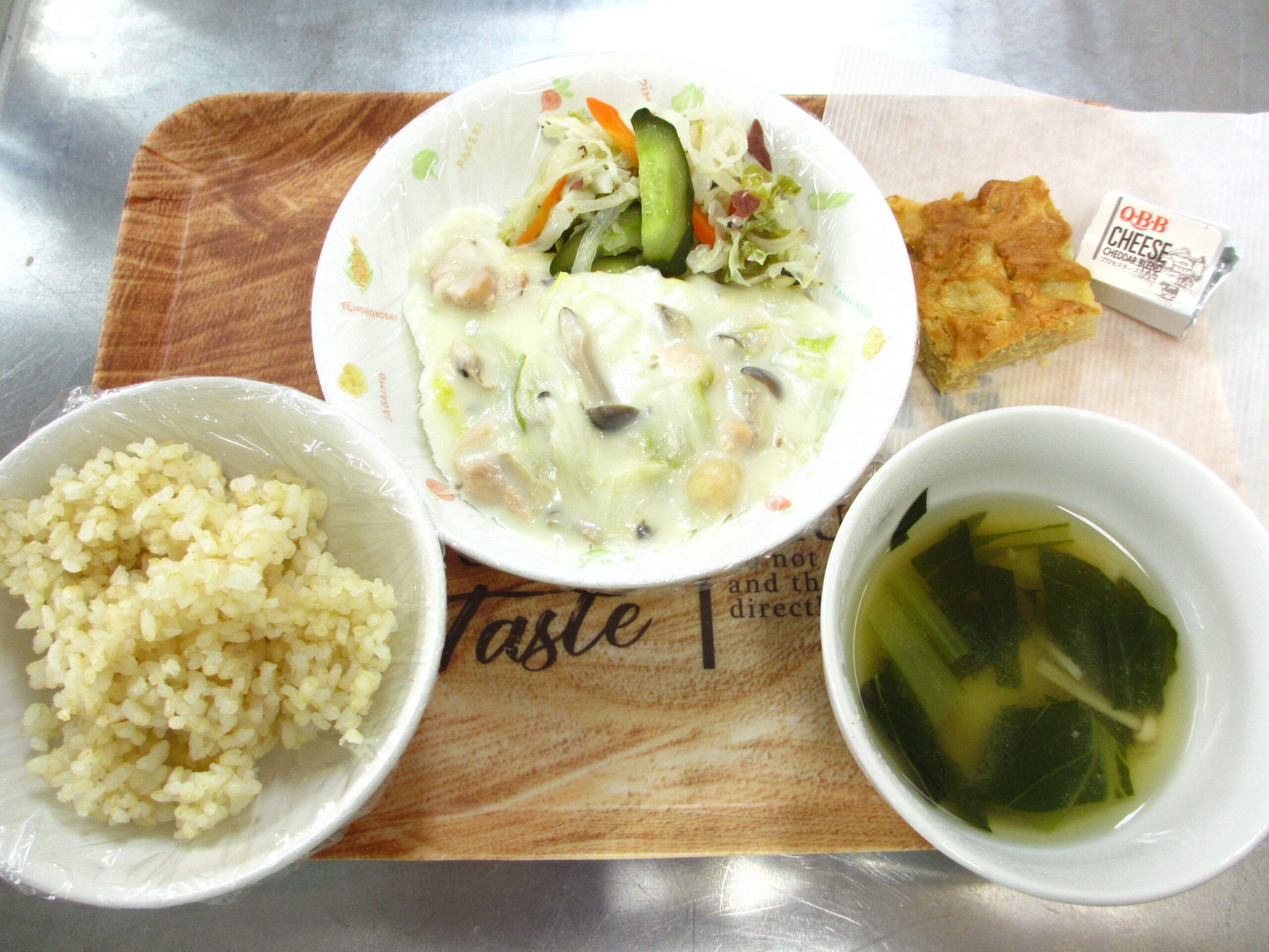 お昼:ごはん 鶏肉と白菜のクリーム煮 梅ドレサラダ 味噌汁