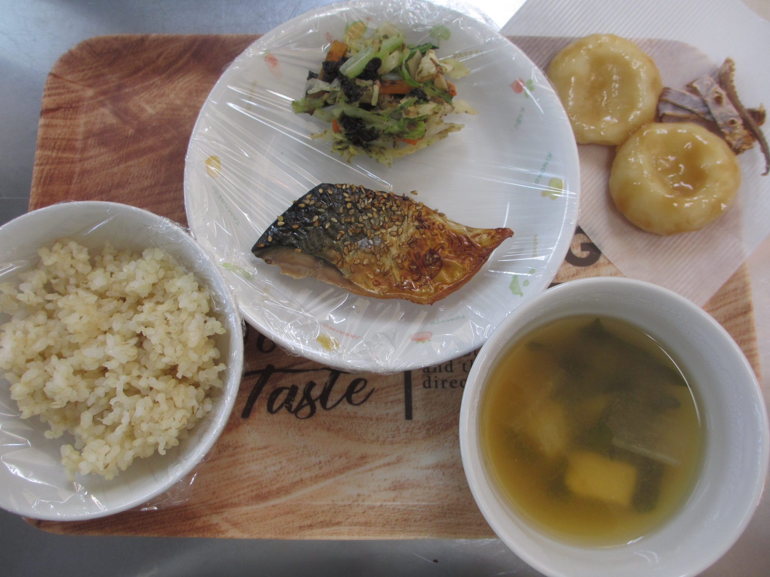 お昼:ごはん 鯖のごまだれ焼き 磯香和え 味噌汁