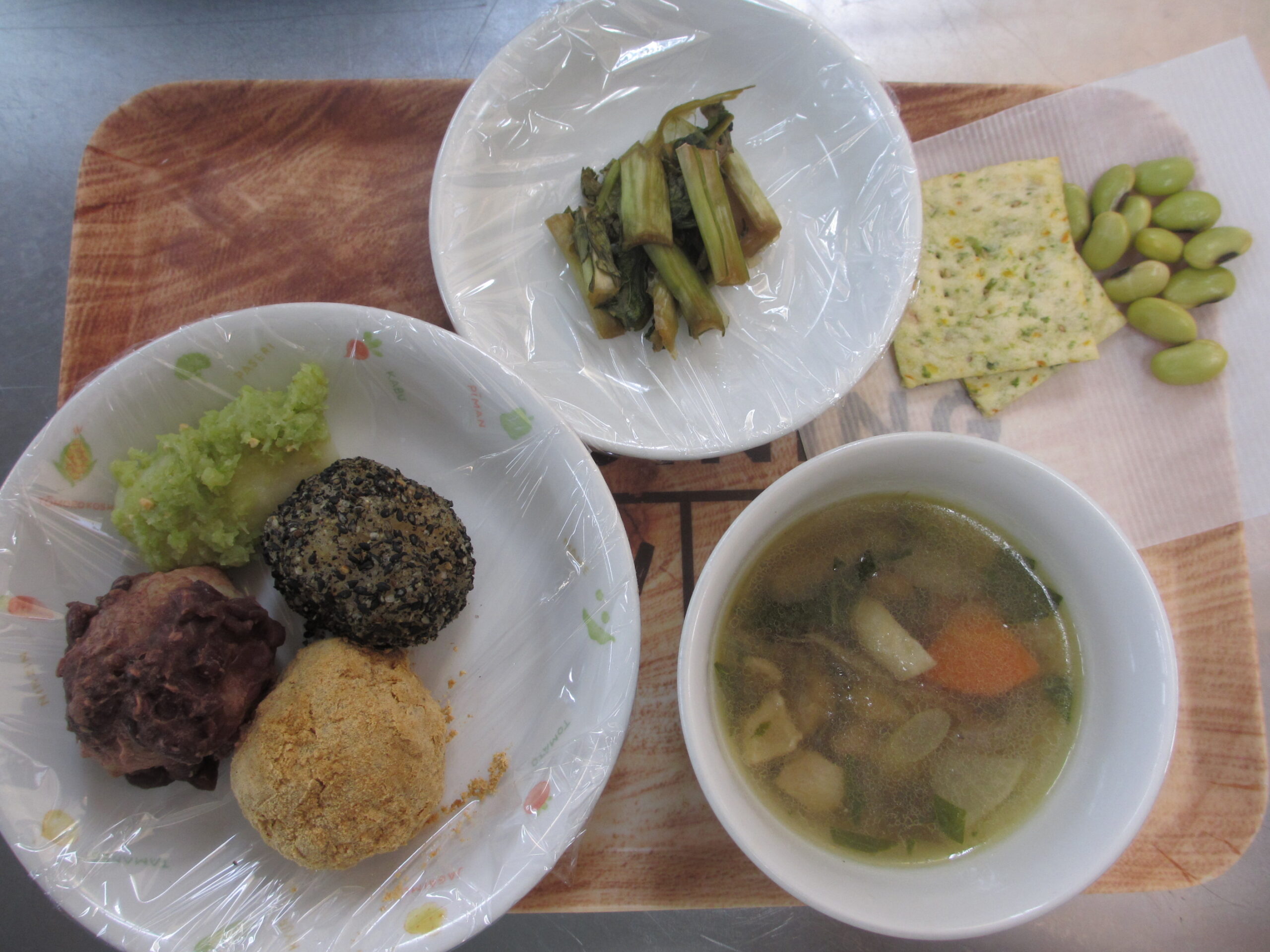 保育園で煮たあんこときなこと、大根おろし、胡麻の4種類を作りました!