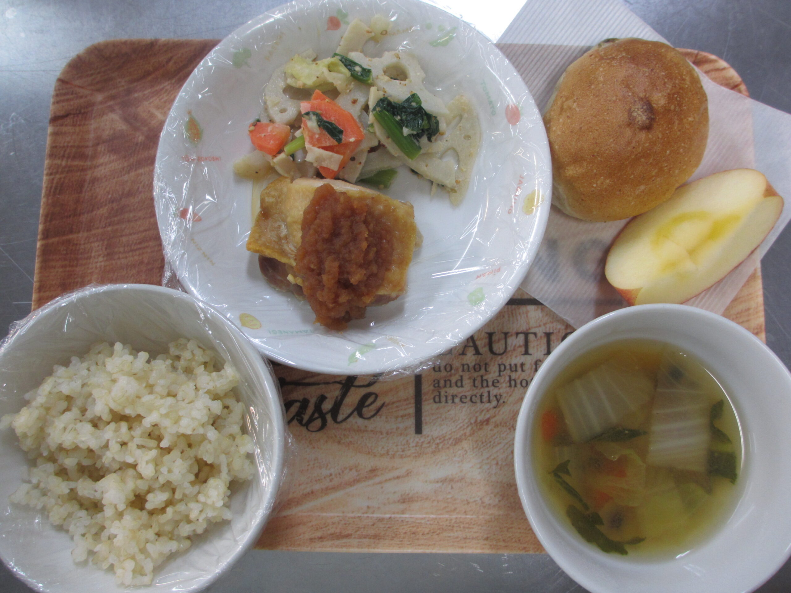 副菜に先月らいおん組さんと一緒に漬けた野沢菜漬けを出しました。