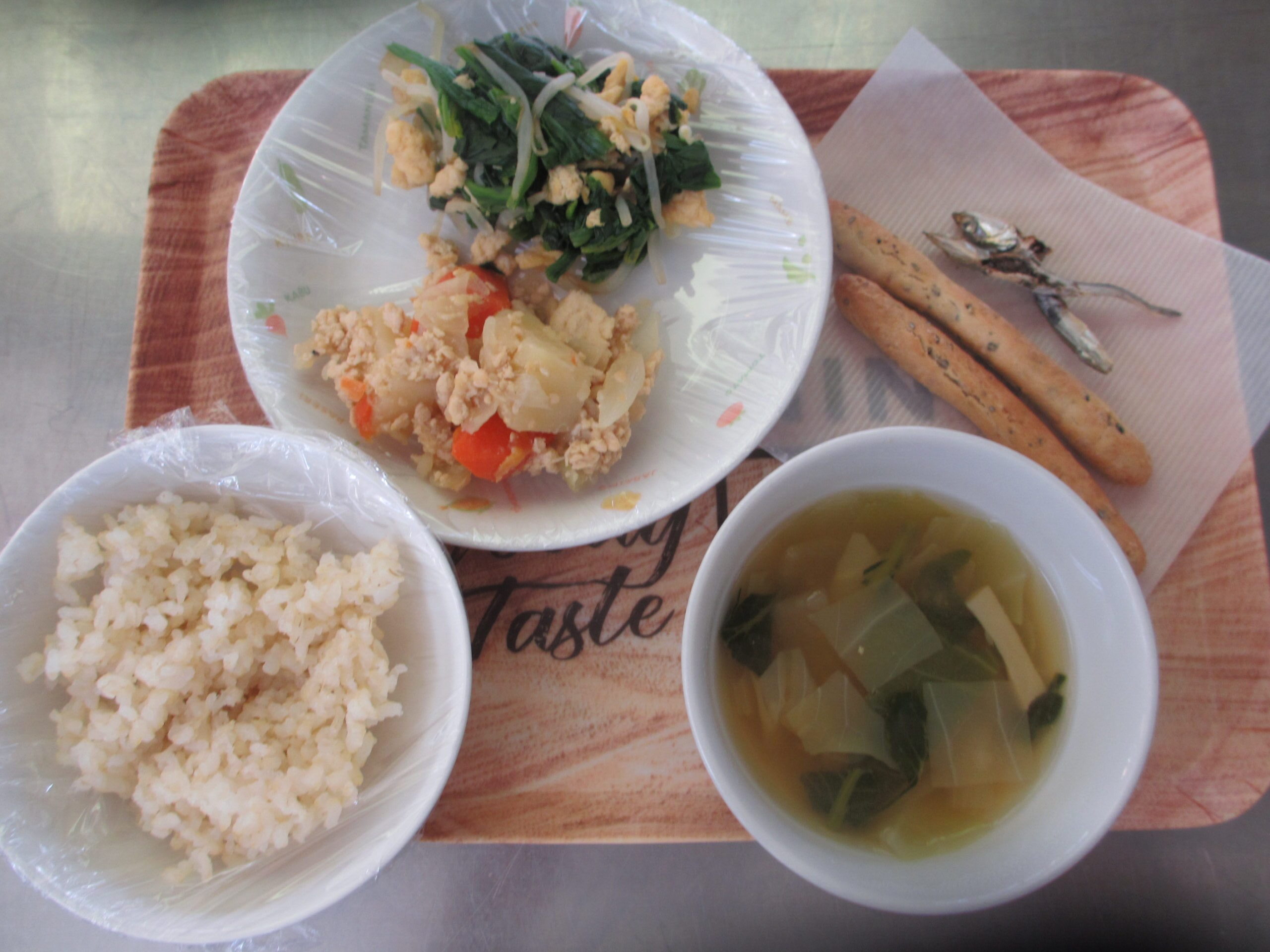 お昼:ごはん、凍豆腐そぼろ煮、三色お浸し、みそ汁