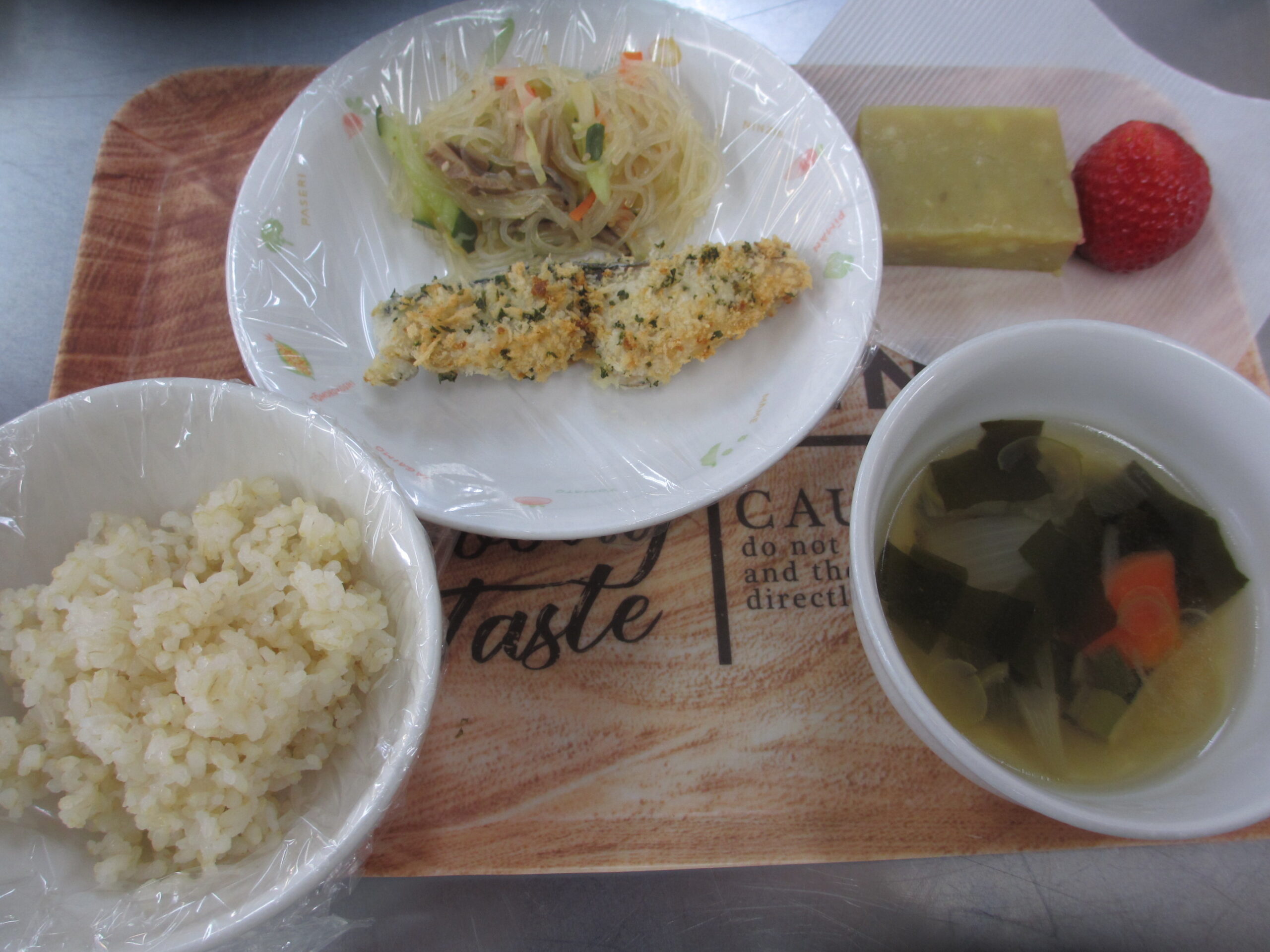 お昼:ごはん、さわらのパン粉焼き、春雨サラダ、韓国風わかめスープ